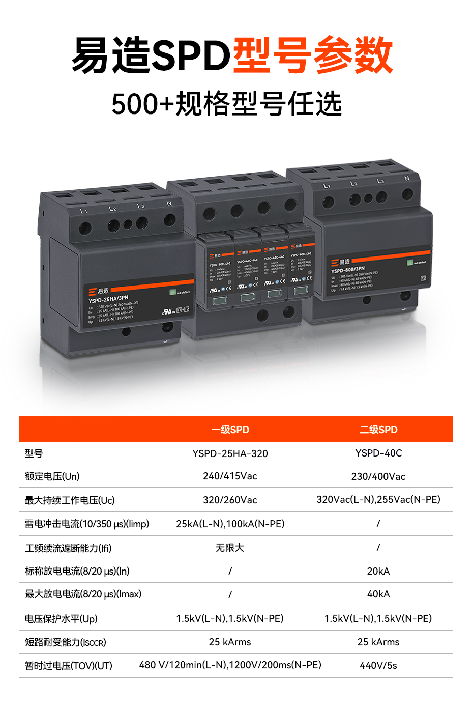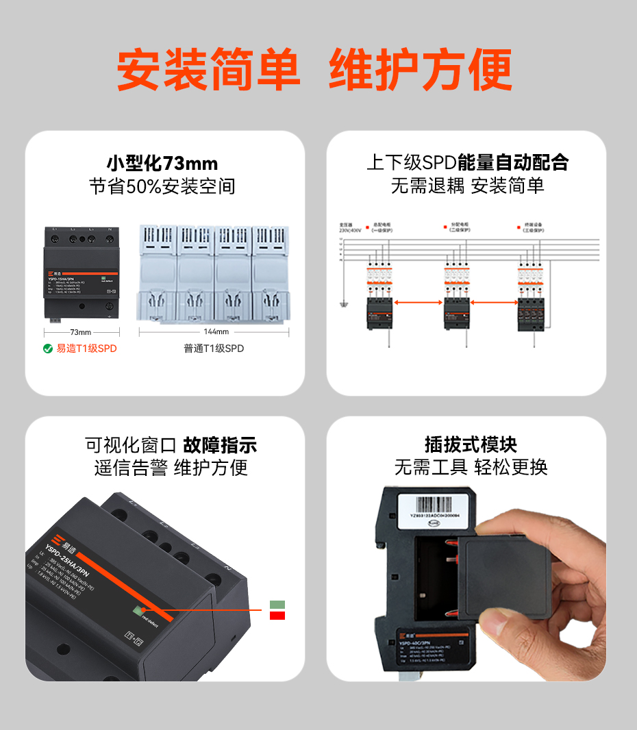 易造YSPD系列一級(jí)、二級(jí)、三級(jí)電源防雷器將安全和創(chuàng)新出色地融合在一起,采用突破性MG復(fù)合型技術(shù),解決了傳統(tǒng)SPD的短板缺陷,無(wú)續(xù)流無(wú)漏電流,延長(zhǎng)了SPD使用壽命并提高了供電效率;易造SPD小型化設(shè)計(jì),每相寬度僅一個(gè)模數(shù)(18mm),使配電箱的空間更充裕,并具有本地及遠(yuǎn)程告警功能,維護(hù)方便;靈活的鏈?zhǔn)椒烹娂夹g(shù)簡(jiǎn)化了SPD的安裝方式,上下級(jí)SPD能量自動(dòng)配合,無(wú)需退耦器,顯著提升了電涌保護(hù)效率和TOV耐受能力,確保供電系統(tǒng)的穩(wěn)定性。